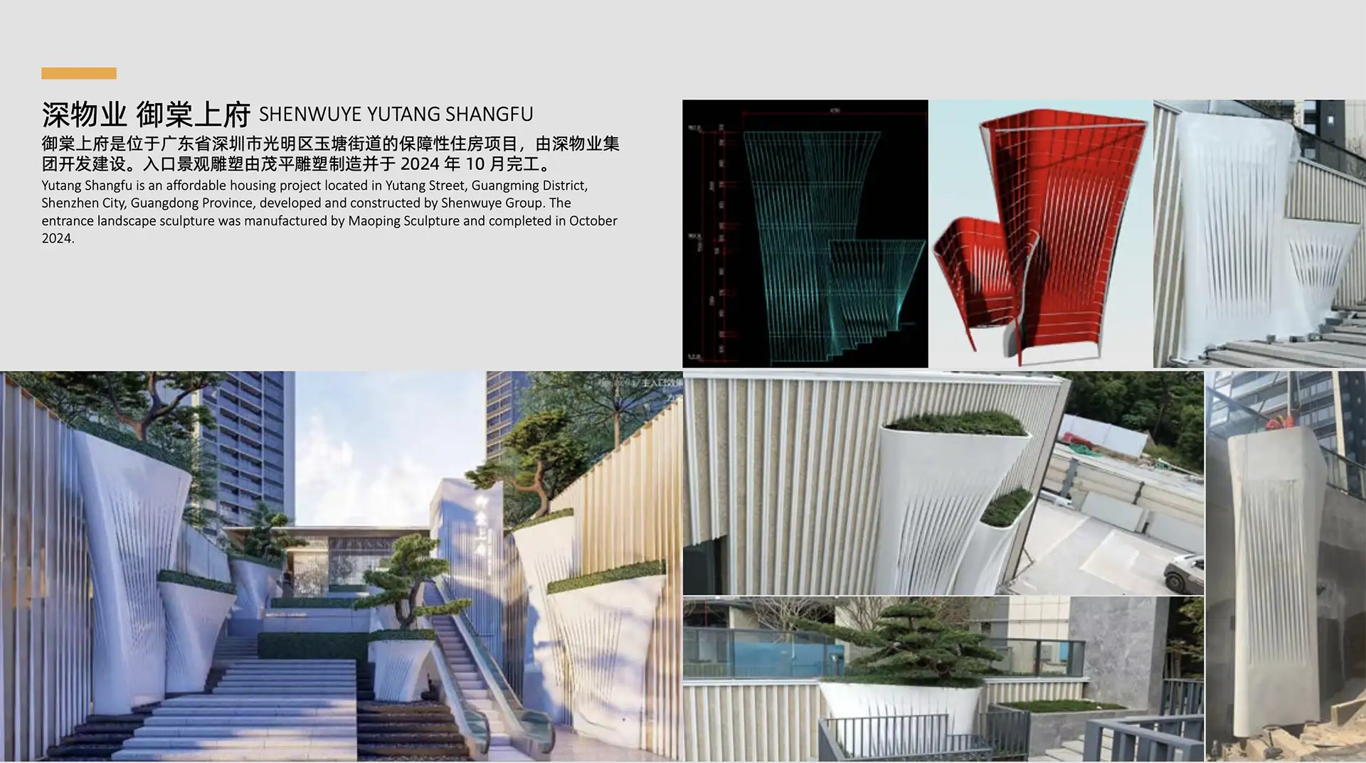 Shenzhen City, Guangdong Province, developed and constructed by Shenwuye Group. The entrance landscape sculpture was manufactured by Maoping Sculpture and completed in October