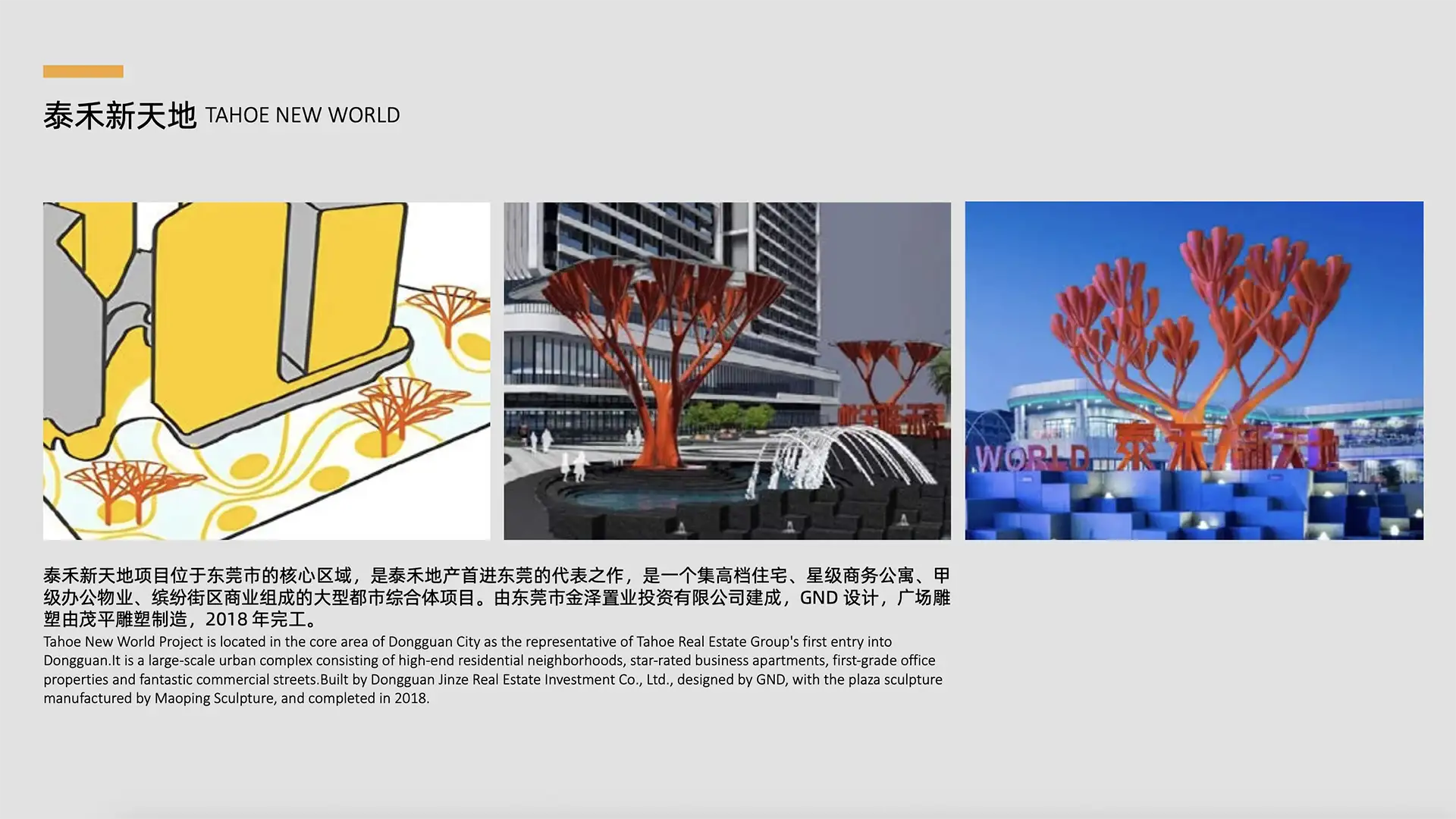 Tahoe New World Project is located in the core area of Dongguan City as the representative of Tahoe Real Estate Group's first entry into Dongguan.It is a large-scale urban complex consisting of high-end residential neighborhoods, star-rated business apartments, first-grade office properties and fantastic commercial streets. Built by Dongguan Jinze Real Estate Investment Co., Ltd., designed by GND, with the plaza sculpture manufactured by Maoping Sculpture, and completed in 2018.