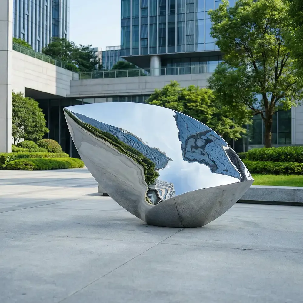 This Abstract Mirror Stainless Steel Sculpture is a contemporary outdoor artwork designed to enhance modern architectural and landscape environments.