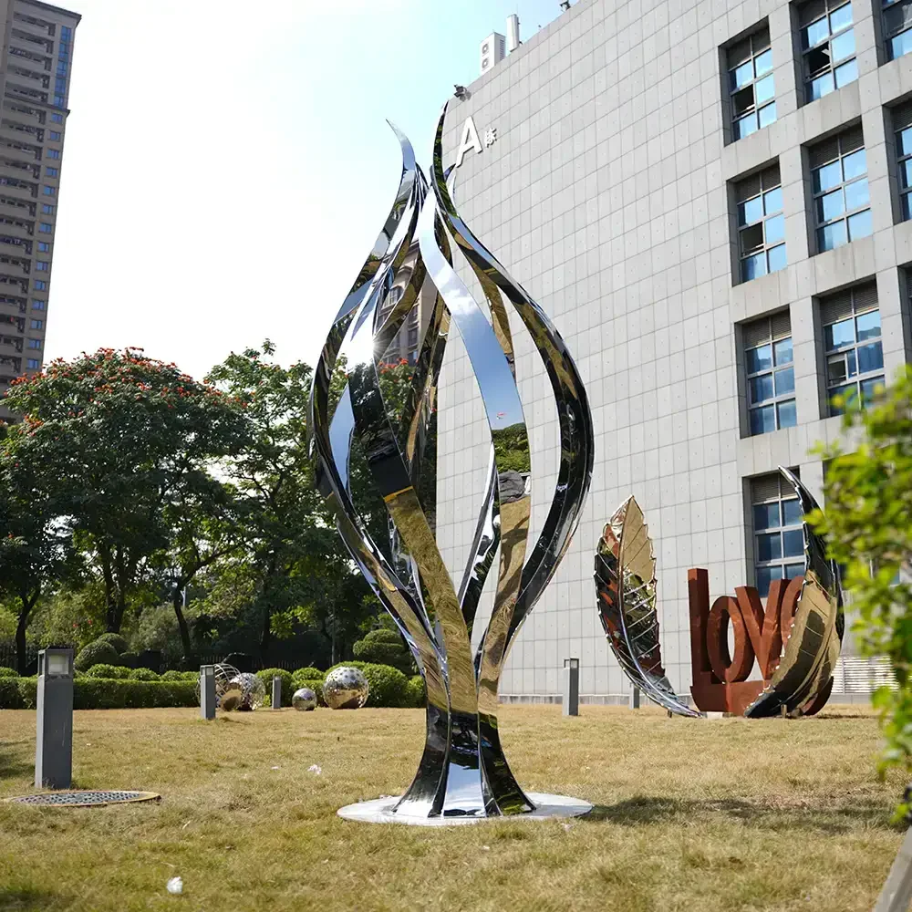 Abstract Mirror Stainless Steel Outdoor Sculpture is a large-scale contemporary public artwork characterized by its elegant organic form and highly reflective surface. Crafted from premium stainless steel with a mirror-polished finish, the sculpture rises vertically with flowing, flame-like curves that create a strong sense of movement, growth, and vitality.