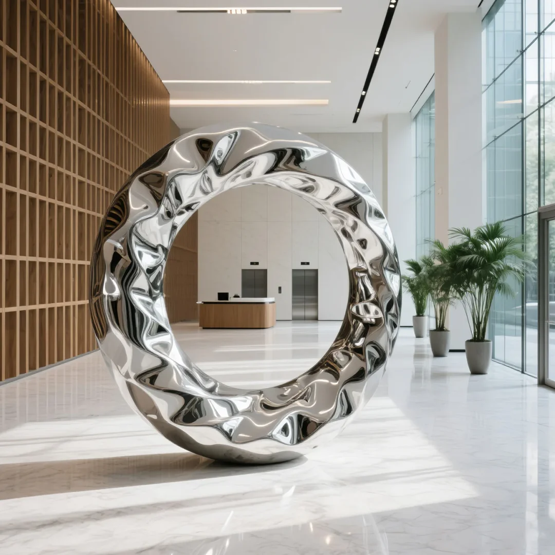 “The Flowing Ring” Modern Stainless Steel Sculpture is a striking modern abstract sculpture that reinterprets the traditional symbol of a ring, transforming it into a dynamic, fluid form. The gently twisted surface of the ring captures movement, suggesting the constant flow of energy and time. The polished mirror finish amplifies the sculpture’s reflective qualities, creating an ever-changing visual experience as it interacts with light and its surroundings.