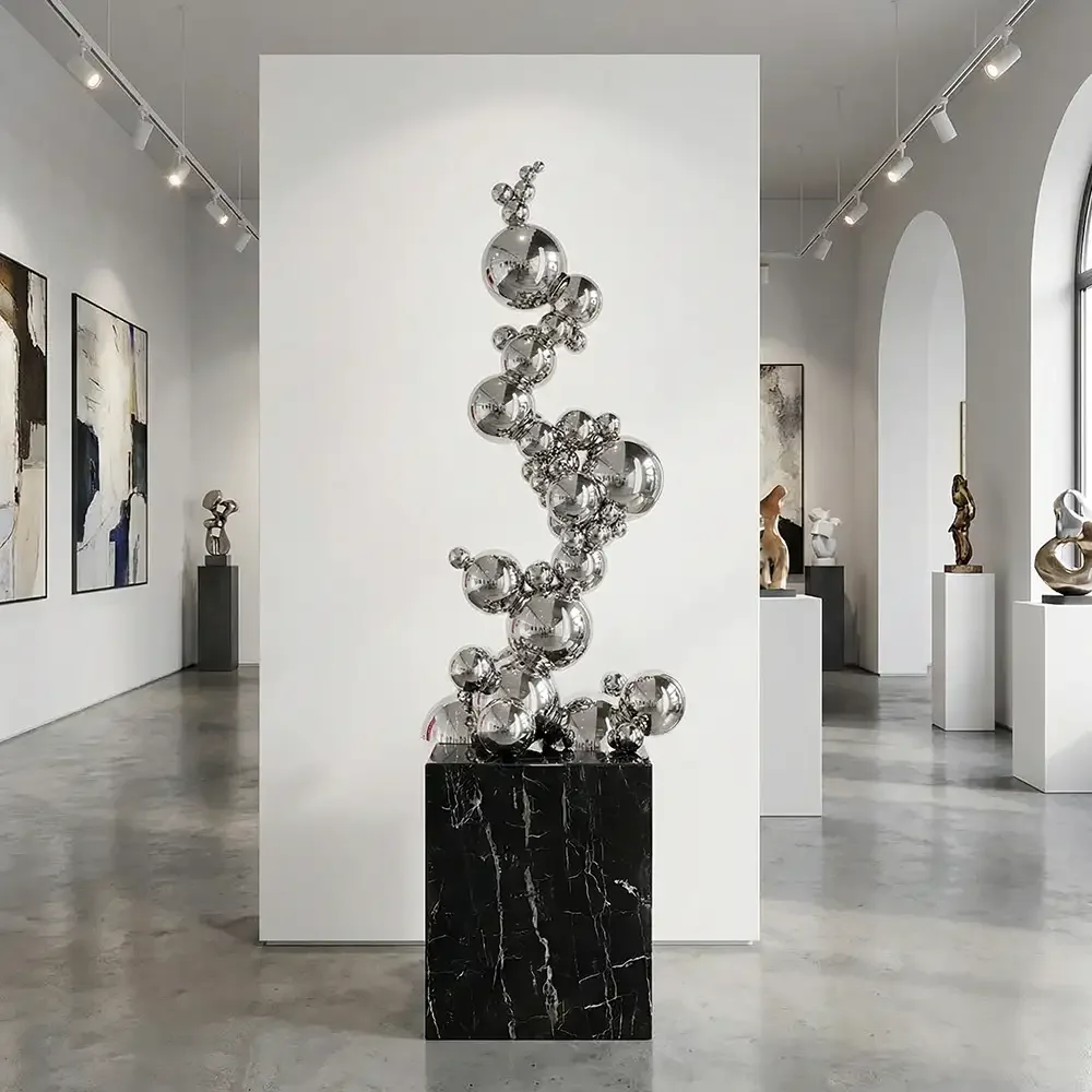 This contemporary abstract sculpture features a dynamic composition of mirror-polished stainless steel spheres, creating a striking visual balance between reflection, light, and form. The clustered bubble design captures surrounding environments from every angle, producing ever-changing reflections that enhance both indoor and outdoor spaces.